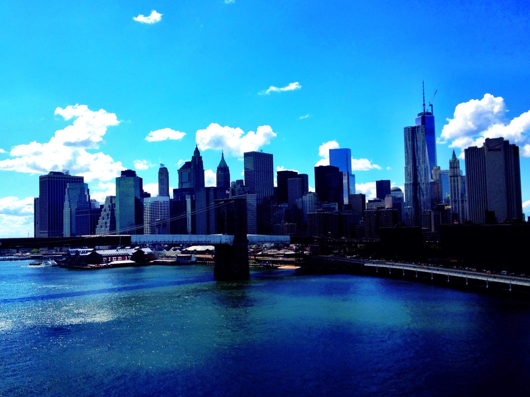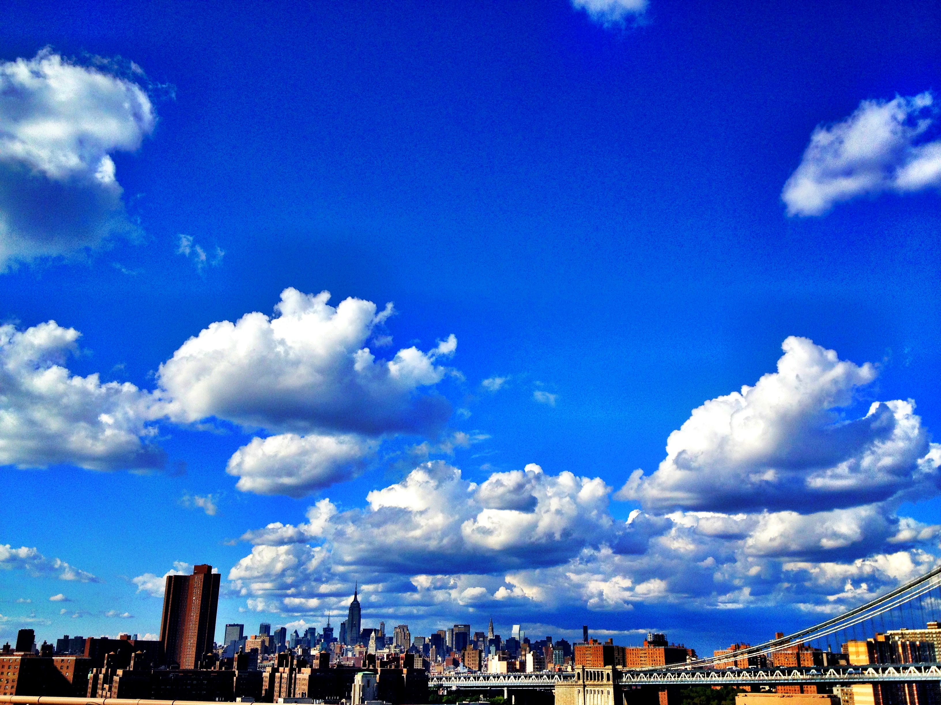 but then the view from atop the bridge forces me to come to a stop. an uninterrupted horizon reaches out to the magnificent manhattan skyline. on this clear day, with only a couple vanilla colored cotton candy like clouds passing above, the east river is glittering as if the kohi noor and the cullinan diamond are fighting for attention at the bottom of the banks. steel structures are bursting into the sky. they were built to be appreciated on days like this.